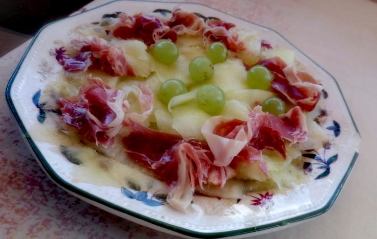 CARPACCIO DE MELÓN CON JAMÓN IBÉRICO Y UVAS.