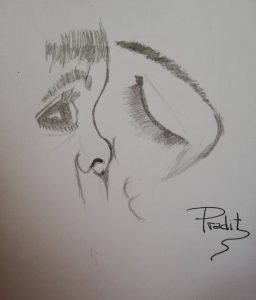 Pradit nos abre la puerta a su mundo a través de dibujos y bocetos que parecen respirar por sí mismos. Cada trazo suyo es una emoción en movimiento, un susurro de color que invita a detenerse y mirar más despacio. A partir de esas imágenes, yo escribo: dejo que sus formas y tonos se cuelen en mis entrañas y, desde ahí, nacen textos con las emociones a flor de piel.