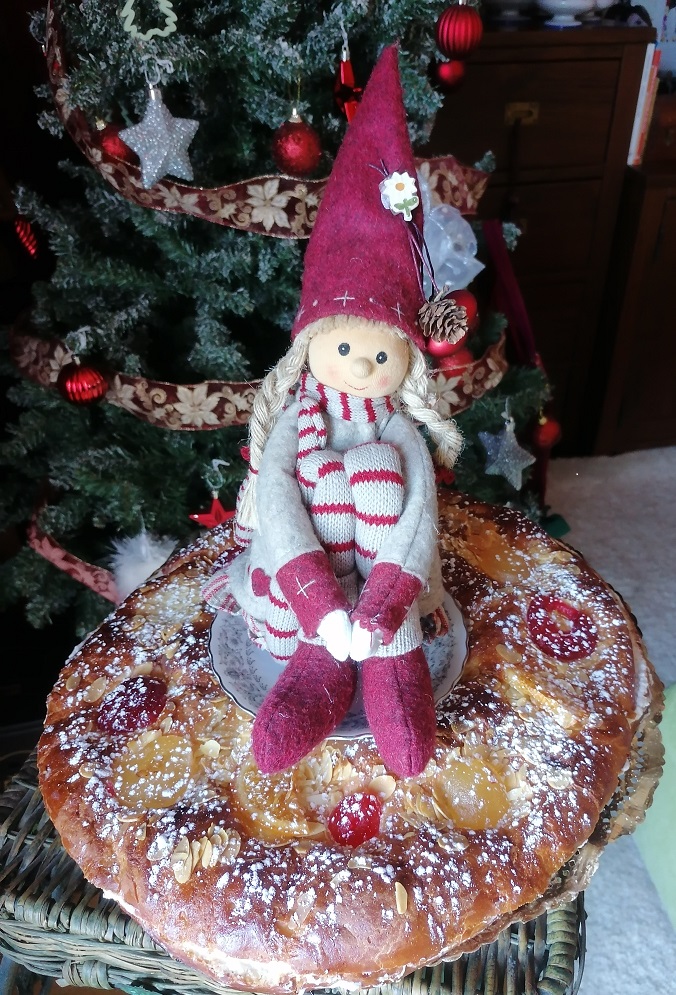 Mientras se calienta el horno, pintamos el roscón con huevo batido y lo adornamos como más nos guste: almendras laminadas, fruta escarchada, azúcar almibarada….