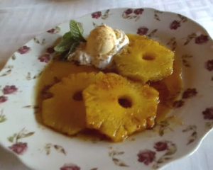 ingredientes: 4 rodajas de piña en almibar 2 cucharas soperas de azucar 50 gr de mantequilla El zumo de una naranja 1 dl de brandy,