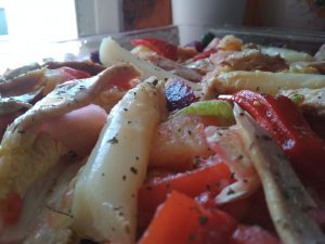 Ingredientes para 4 tragaldabas 6 u 8 lomos (800 gr aproximadamente) de bacalao desalado 2 cebollas medianas 2 pimientos del piquillo 1 pimiento verde 1