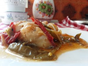 Ingredientes para 4 tragaldabas 6 u 8 lomos (800 gr aproximadamente) de bacalao desalado 2 cebollas medianas 2 pimientos del piquillo 1 pimiento verde 1