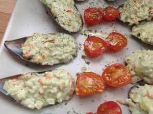 Ingredientes para 4 tragaldabas 2 kg de mejillones frescos 5 palos de carne de cangrejo 2 aguacates un puñado de aceitunas con sabor anchoa 1